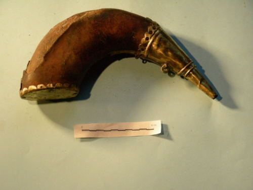 A forma di corno; fondo chiuso con lamierino fissato al corpo con quattro chiodini e bordo ripiegato sul corpo della fiasca, rifinito con smerli a semicerchio. Bocca conica incalzata sul corpo con decorazioni a motivi geometrici e due anelli per il correggiolo.
