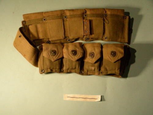 A dieci tasche fissate con borchie divise in due gruppi, raccordate da cinturone regolabile all'interno. Chiusura a gancio ad incastro. Ciascuna tasca è dotata di chiusura a bottone a pressione che copre ulteriore cinturino di sicurezza con bottone a pressione.