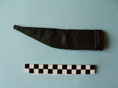 in cuoio, rivestito in pelle naturale (marocchino) marrone. Decorazioni geometriche incise distribuite su tutta la superficie della faccia frontale. Cucitura sul retro.