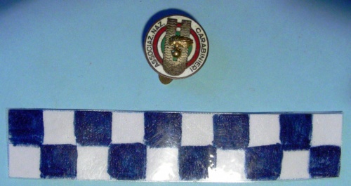 Di forma circolare, con tre cerchi concentrici di colore rosso, bianco e verde su base bianca. Al centro, in rilievo, granata dorata con fiamma piegata al vento su una forma di U argentata con zigrinature e sottostanti rami d'alloro. Iscrizione lungo la corona. Sul verso spilla per il fissaggio a forma di goccia rovesciata con iscrizione.