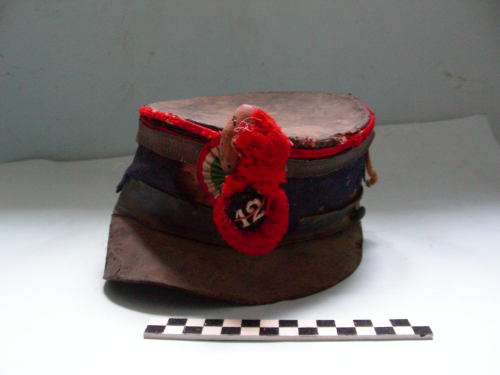 Corpo di foggia bassa, circolare, rivestito di panno turchino, fascia di colore rosso sormontata da ulteriore fascia dorata all'imperiale di tela cerata, fascia alta sul bordo inferiore con due bottoni ai lati, visiera, nappina poggiante su coccarda tricolore e recante il numero del reggimento su un bottone nero, profili verticali di colore giallo. Interno foderato di raso con due magliette laterali e con etichetta stampata in oro su pelle all'interno dell'imperiale.