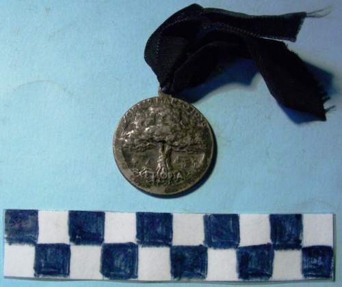 Di forma circolare. Sul recto, al centro, in rilievo albero con fronde che affonda le radici in una iscrizione. Sullo sfondo un paesaggio africano con montagne. Ulteriori iscrizioni lungo la corona. Sul verso, al centro, in rilievo il profilo di una montagna. Iscrizioni lungo la corona ed al centro sopra la figura. Anello all'appiccagnolo. Nastrino di colore nero.