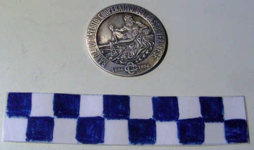 Di forma circolare. Sul recto, al centro, in rilievo, una figura allegorica maschile in nudità eroica, rappresentante il fiume Adige sdraiato su di un fianco nell'atto di reggere una bilancia con la destra ed un'anfora con la sinistra, dalla quale sgorga l'acqua del fiume. Iscrizioni lungo la corona. Sul verso, monogramma al centro ed iscrizione lungo la corona.