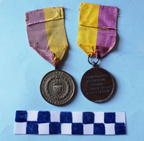 Di forma circolare. Sul recto, al centro, in rilievo stemma coronato del Municipio di Roma circondato da corona d'alloro chiusa da nastri. Iscrizione lungo la corona. Sul verso, al centro, in rilievo iscrizione. Nastrino bipartito giallo e rosso.