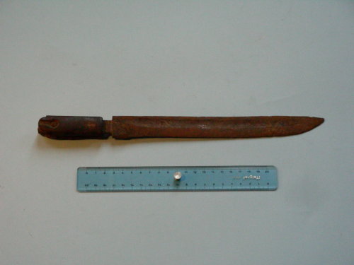 Lama dritta, con sguscio su entrambi i lati fino alla punta, al dorso. Probabilmente ricavato dalla lama di una baionetta, probabilmente Vetterli, di cui conserva parte delle guancette originali.