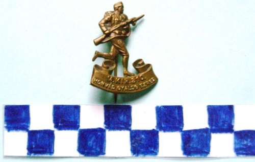 A forma di spilla raffigurante un soldato col fucile imbracciato che corre verso destra con sottostante cartiglio con iscrizione. Sul verso spilla di fissaggio.