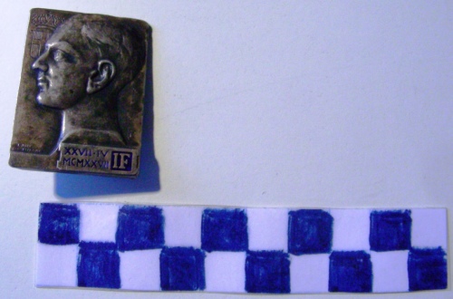 Di forma rettangolare. Sul recto, busto accollato a sinistra a testa scoperta, sovrastante lo stemma coronato di Milano, nell'angolo superiore sinistro. Iscrizione sul lato inferiore a sinistra e in rettangolo sotto la figura, in blu in campo argentato e in argento in campo blu. Sulla destra in basso punzone non riconoscibile. Sul verso spilla di fissaggio con iscrizione.