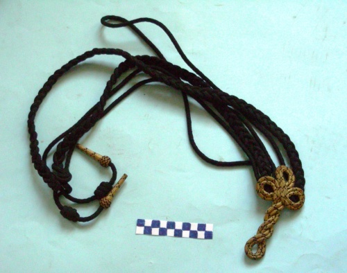 Controspallina intrecciata a fiore in filo dorato, screziato in nero con gancio metallico per il fissaggio. Due cordelline intrecciate, di diversa lunghezza ed integralmente nere. Due cordelline semplici, di colore nero ci diversa circonferenza; la più lunga si raccorda alle cordelline intrecciate, fotma un'asola e termina in due puntali intrecciati in filo dorato screziato in nero.