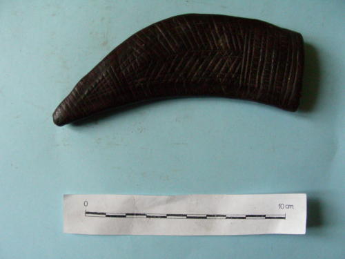 Cuoio grezzo non conciato, rivestito in superficie di pelle color bruno cucita sulla mezzeria di una delle due facce; decorato con incisioni geometriche.
