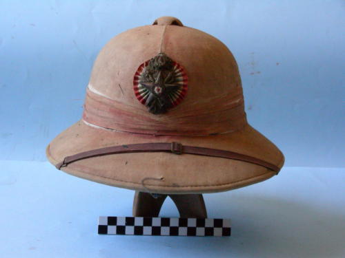 Calotta a quattro sezioni sormontata da calottino in lamiera con quattro fori di aerazione; tesa larga; due fori di aerazione laterale. Fascia posta sopra la tesa, cucita. Rivestimento interno color verde. Sottogola a cinturino regolabile, posizionato sulla visiera. Fregio in posizione frontale.