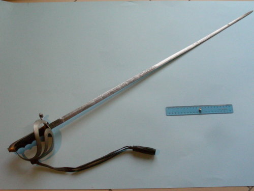 Lama sottile, dritta a filo, punta e controfilo; senza sgusci ed incisa ad acido per tre quarti a motivi militari e floreali. Punta al centro. Fornimento con guardia e due elsi di medio spessore. Sul piatto di guardia è presente la conchiglia per il pollice. Corto ramo di parata a riccio. Cappetta lunga, arrotondata, con dorso zigrinato nell'ultimo quarto. Bottone piatto, ovale, avvitato al codolo. E' presente la dragona. Impugnatura anatomica. Rivestimento al tallone.
