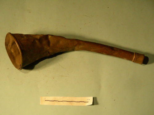 A cornetto, con imboccatura e due losanghe in rilievo per fermare la tracolla.