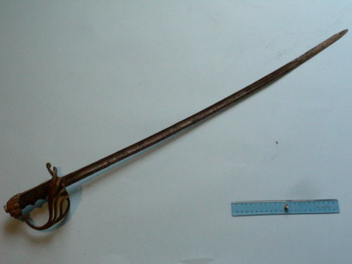 Lama curva, a filo, punta e controfilo; ampie sgusciature sui due lati per i primi tre quarti; per l'ultimo quarto liscia con controfilo; punta al dritto. Fornimento con guardia e tre elsi terminanti a riccio all'estremità, salenti a congiungersi al ramo principale di guardia; il ramo più lungo si sdoppia. Piatto di guardia con conchiglia per il pollice; corto ramo di parata terminante a riccio scanalato. Cappetta lunga che termina superiormente a testa di leone con criniera corta. Bottone ovale, piatto, avvitato al codolo. Impugnatura anatomica.