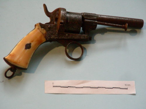 Castello aperto; tacca sulla testa del cane; tamburo fisso a sei cartucce; sportello basculante sul lato destro. Canna rigata. Bacchetta di espulsione fissa sul lato destro del castello. Grilletto ad anello. Castello e tamburo decorati ad incisione a motivi floreali.