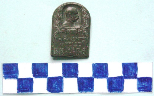 A forma di rettangolo con il lato superiore arrotondato. Nella parte superiore, in rettangolo circondato da serto di alloro, il profilo rivolto a destra, di Francesco Giuseppe con sottostanti iscrizioni. Sul verso, spilla di fissaggio.