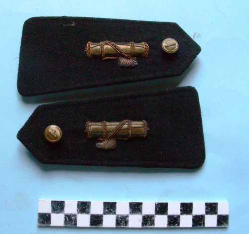 A forma di pentagono con lati lunghi leggermente convergenti verso il vertice. Rivestita di panno nero con fregio in canottiglia dorata ed argentata. Bottone di fissaggio dorato con con vite di chiusura Sul verso cinturino di fissaggio di colore nero.