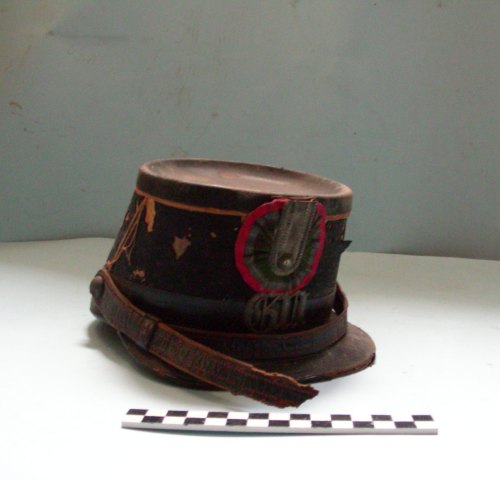 Corpo di foggia bassa, circolare, piegato in avanti, rivestito di panno nero, fascia sul bordo inferiore, visiera, soggolo fissato ai lati con due bottoni, fregio frontale della Guardia Nazionale, cappietto poggiante su coccarda tricolore, tre profili verticali. Interno rivestito di pelle rossa con bordi fermati da un bottone.