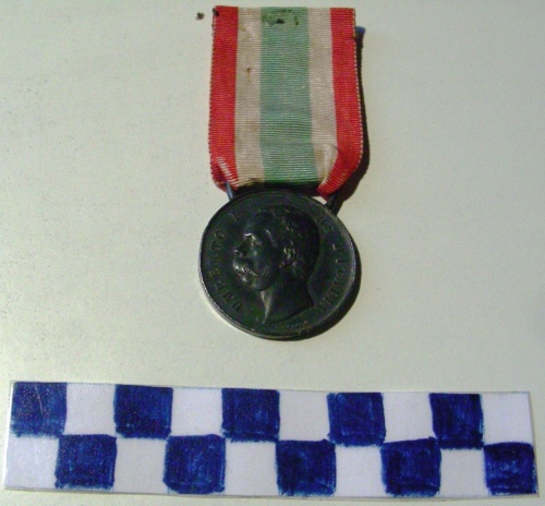 Di forma circolare. Sul recto, al centro, in rilievo busto accollato a sinistra di Umberto I. Iscrizioni ai lati e sotto la figura. Sul verso iscrizioni entro corona d'alloro. Nastrino con i colori rosso e bianco ripetuti due volte con striscia verde di maggior larghezza al centro.