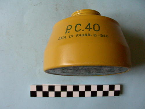Corpo a tronco di cono, con cilindro filettato all'apice contornato da guarnizione e chiuso da coperchio avvitato. Due stellette in rilievo ai lati del coperchio. Disco removibile alla base con linguetta color arancio. Verniciatura color giallo.