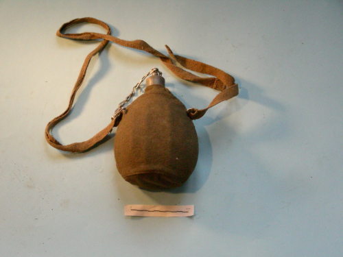 Tappo a vite zigrinato fissato al corpo con catenella metallica con foro e tappino all'apice; telino grigio-verde cucito al corpo; tracolla regolabile fissata a due magliette laterali.