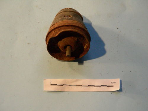 Corpo principale cilindrico e parte superiore a tronco di cono, a ghiere concentriche e calotta superiore; due fori sulla seconda ghiera, graduata da 6 a 7(?). Tubo di raccordo sporgente al centro della base.