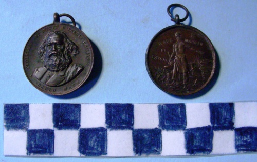 Di forma circolare. Sul recto, al centro, in rilievo il busto di fronte di Marx. Iscrizioni lungo la corona e sotto la figura a destra. Sul verso, al centro, in rilievo figura intera di operaio a torso nudo con grembiule e un martello nella mano destra. In secondo piano una ruota dentata, un ramo di felce, un incudine e a destra un sole nascente raggiante, un libro ed un'urna su un tavolo. Iscrizioni intorno alla figura. Anello all'appiccagnolo.