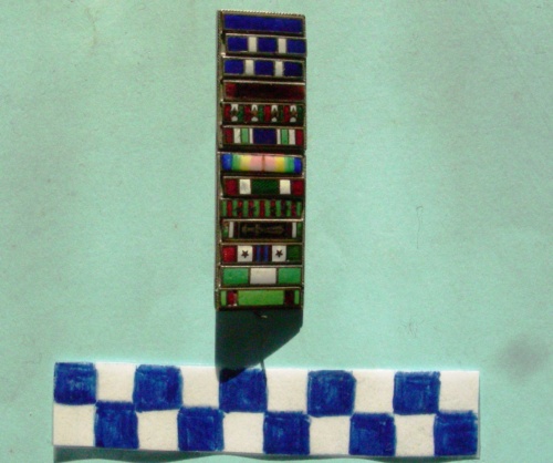 Tre lastrine di metallo saldate a comporre un lungo rettangolo con una serie di 13 fori per lato per il fissaggio dei nastrini. Sul verso sono saldati un fermaglio a forma di goccia rovesciata, nella parte superiore ed un disco con uno spillo nella parte inferiore per il fissaggio. Sul dritto sono fissate 13 barrette metalliche smaltate in colori diversi a rappresentare le diverse decorazioni. Dall'alto: 1) nastrino blu per croce al valor militare, 2-3) due nastrini blu con due bande bianche per croce al merito di guerra, 4) nastrino ambra per medaglia di benemerenza guerra italo-austriaca 15-18, 5) nastrino a bande rosse-bianche-verdi ripetute 4 volte con 4 stellette a cinque punte sulle bande bianche per volontario di guerra 15-18, 4 anni, 6) nastrino con bande rosse-bianche-verdi bianche ripetute due volte con al centro una banda blu per medaglia ai benemeriti degli uffici notifiche alle famiglie dei militari (?), 7) nastrino a bande blu-verdi-gialle-rosse ripetute una volta al contrario per medaglia commemorativa della vittoria 1918, 8) nastrino a bande rosse-bianch, ripetute una volta con al centro una banda verde. decorazione per l'unità d'Italia, 9) nastrino con 8 bande verdi e 7 rosse alternate con 4 stellette a cinque punte per croce di guerra francese, quattro anni 1915-18 10) nastrino con bande verdi-bianche e rosse ripetute due volte con al centro una daga dorata in campo nero per anni di servizio alla Milizia Volontaria Sicurezza Nazionale, 11) nastrino a bande rossa, bianca, 3 piccole bande rosse intervallate da due bande verdi, ulteriore banda bianca e verde, con due stellette a cinque punte sulle bande bianche per medaglia commemorativa della guerra di liberazione, una stelletta per anno di partecipazione, 12) nastrino con due bande verdi e banda bianca al centro per croce di anzianità di servizio, 16 anni, 13) nastrino con due bande rosse in campo verde per onorificenza OMRI.