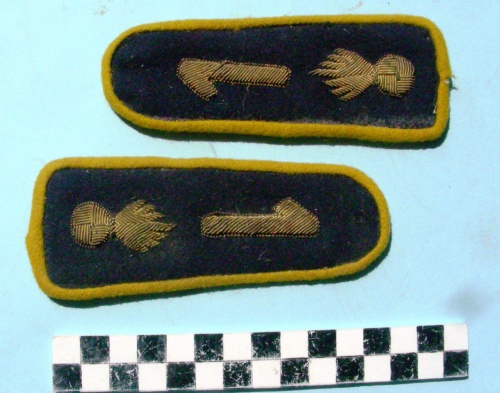 Rettangolo di panno nero con angoli arrotondati e lati lunghi leggermente convergenti verso il lato corto superiore. Bordi di panno giallo. Sul piatto ricamati in canottiglia dorata un grande numero 1 che sovrasta una bomba con fiamma verticale.