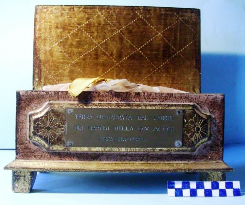 A forma di parallelepipedo con quattro piedini, decorata a motivi floreali ad intarsio sulle facce visibili. Coperchio sulla parte superiore apribile verso l'alto con due cerniere. Sulla faccia anteriore, fermata da quattro viti una placca con iscrizione. All'interno, foderato di rosso, è conservata della terra rossastra in un sacchetto di plastica chiuso da un nastro giallo con striscia nera al centro.