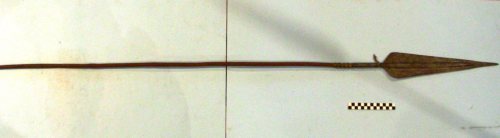 lama a fiamma, piatta, con nervatura centrale. Lamierino di rame avvolto a spirale sull’asta all’attaccatura del ferro. Asta originale con incisioni a spirale per tutta la lunghezza e intaglio al puntale.
