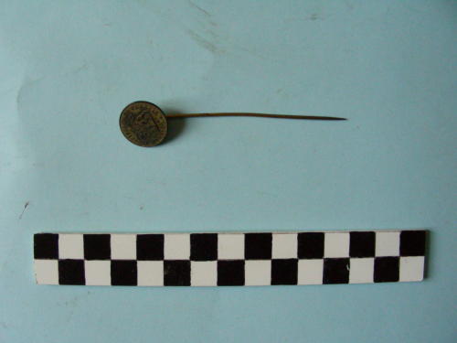 ricavato da una moneta da 15 centesimi del governo provvisorio di Venezia. Sul dritto della moneta leone di S.Marco con libro aperto; sul rovescio al centro numero "15" indicante il valore, parzialmente occultato dalla saldatura del perno in metallo che forma lo spillone.