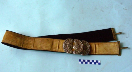 Larga fascia in tessuto dorato, al verso di velluto nero terminante con due magliette e moschettoni dorati per il fissaggio agli anelli di una giberntta. Grande fibbia metallica per la regolazione in tre parti, una doppia valva, un passante ed una valva singola, il tutto decorato a motivi floreali in rilievo.