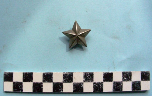 A cinque punte in lamierino sagomato in rilievo con lembi ripiegati su una base con foro centrale per l'inserimento di una vite di fissaggio con testa tonda di grandi dimensioni e zigrinata.