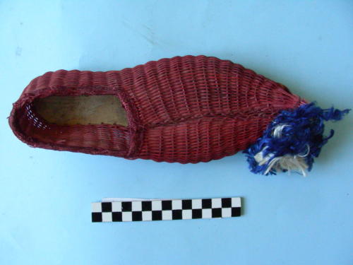 Calzatura sinistra, a punta. Di colore rosso, con suola piatta e pon-pon bianco e blu sulla punta. Struttura a fili intrecciati con orlo al collo del piede.