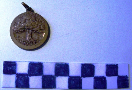 Di forma circolare. Sul recto, al centro, in rilievo albero con fronde che affonda le radici in una iscrizione. Sullo sfondo un paesaggio africano con montagne. Ulteriori iscrizioni lungo la corona. Sul verso, al centro, in rilievo il profilo di una montagna. Iscrizioni lungo la corona ed al centro sopra la figura. Anello all'appiccagnolo.