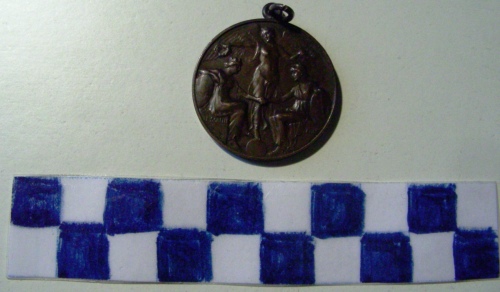 Di forma circolare. Sul recto, al centro, in rilievo, figura allegorica della Vittoria alata che poggia su un sole nascente raggiante. Nelle mani due serti d'alloro posti sul capo di due figure allegoriche femminili sedute su due troni: a sinistra l'Italia turrita che poggia la mano destra sullo scudo sabaudo, con la sinistra stringe la mano destra della Francia seduta, che regge con la sinistra uno scudo con fascio littorio. Iscrizioni sui lati dei troni. Punzone illeggibile a sinistra in basso. Sul verso, corona d'alloro avvolta da nastro recante iscriziene. Ulteriore iscrizione al centro divisa dal nastro.