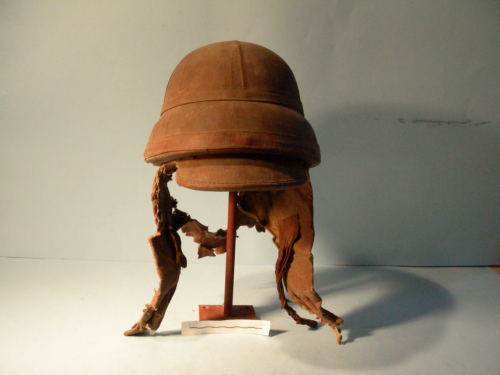 Calotta quadripartita; con visiera, imbottitura, paranuca e paraorecchie con bottoni in funzione di sottogola; due fori sui paraorecchie. Conserva parte di un sottogola a cinturino.