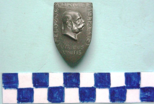 A forma di scudo. Al centro, in rilievo, profilo rivolto a destra di Francesco Giuseppe, circondato da iscrizoni. Sul verso spilla di fissaggio ed ulteriore iscrizione illeggibile.