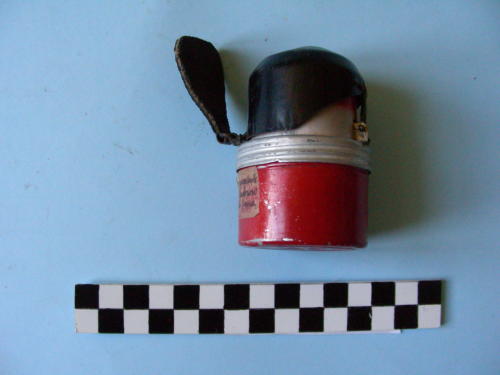 Involucro cilindrico di colore rosso con parte superiore avvitata, di diametro inferiore e con sommità arrotondata, sormontata da coperchio di colore nero, apribile su un lato e fermato da sicura con linguetta triangolare.