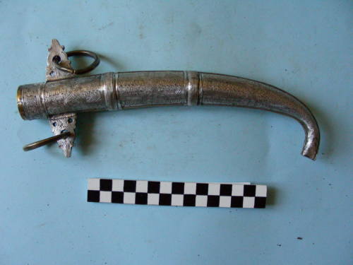 è in legno rivestito da due lamine dottone a conchiglia, unite per la generatrice e con due fasce di rinforzo in ottone nella parte centrale. Il rivestimento esterno, esposto, è quasi completamente placcato con una lamina dargento finemente incisa a bulino. La lamina interna, non esposta, presenta lievi decorazioni a zig-zag. Sotto la cappa sono presenti due sporgenze simmetriche, a forma triangolare. La parte esposta è placcata dargento, e due fori al centro fanno da supporto a due campanelle dottone. Il puntale è molto ricurvo.