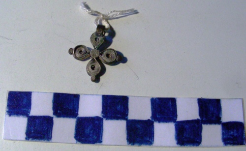 A forma di croce copta etiope con i bracci arrotondati riempiti da una lamina arrotolata.