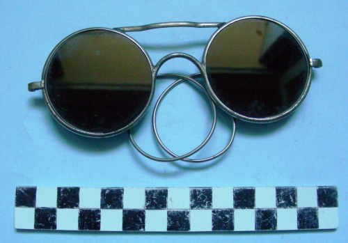 Montatura cerchiata. Lenti circolari molto spesse di colore verde bottiglia. cerniere laterali con viti, stanghette a riccio, ponte superiore saldato alla montature delle lenti, nasello, paraocchi fissati alle lenti, con occhielli chiusi da rivetti nei quali sono inserite le stanghette.
