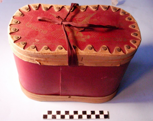 Parallelepipedo di forma ellissoidale di colore rosso scuro. La base ed i lati del coperchio, di colore ocra, sono fissati tramite 27 rivetti inseriti in triangoli con vertice arrotondato; i lembi sono chiusi con punti metallici. Due fettucce di chiusura, di colore rosso scuro, sono state inserite al centro delle facce lunghe sotto il coperchio. All'interno, al centro è stato posizionato un parallelepipedo con le due faccie corte rientranti, su una delle quali è stata fissato, con punti metallici, un piccolo contenitore rovesciato e rialzabile. Su ogni faccia lunga del parallelepipedo sono state inserite due fettucce, di colore rosso scuro, per il fissaggio di oggetti.