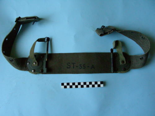 Chiusura a gancio con estremità regolabili a doppio passante; quattro fori per ciascuna sezione di cinta, che si raccorda alla parte posteriore, più larga, mediante due placche metalliche fissate con cinque ribattini. Un ulteriore ribattino centrale per ciascuna placca fissa una fettuccia cui è agganciato, tramite maglietta, un perno il cui alloggiamento si trova ad un'estremità di ogni placca.