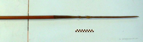 lama a forma di puntone a sezione quadrata. Presenta un ingrossamento decorativo alla fine della gorbia e un inserto decorativo in lega di rame, niellato sulla lama. Asta non originale ed impropria.