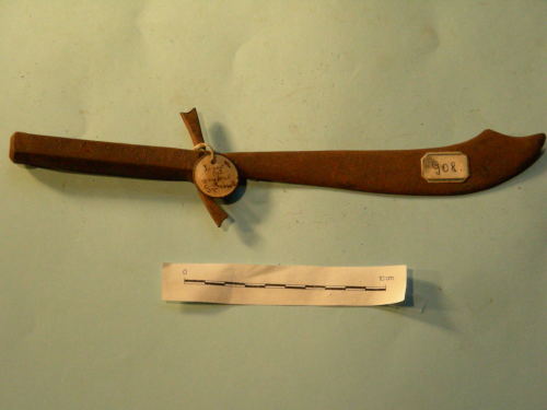 Lama a forma di scimitarra, in un solo pezzo con l'impugnatura. Guardia ad "S" ricavata da un tondino infilata in un foro dell'impugnatura. Impugnatura decorata ad incisione a caratteri alfanumerici.