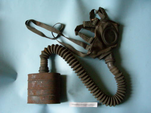 Facciale con due lenti circolari contornate da lamierina metallica e nove magliette che fissano gli elastici di fissaggio alla nuca e la tracolla. Valvola sormontata da tubo di giunzione con chiusura ad avvitamento con corona zigrinata, che accoglie il tubo flessibile di collegamento con il filtro. Filtro a base ellittica, con nervature sul corpo principale, tappo alla base fissato con catenella e imboccatura filettata.