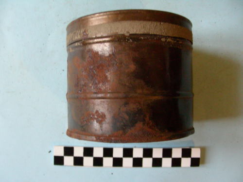 Di forma cilindrica, con coperchio ad incastro; interno foderato di cartone.