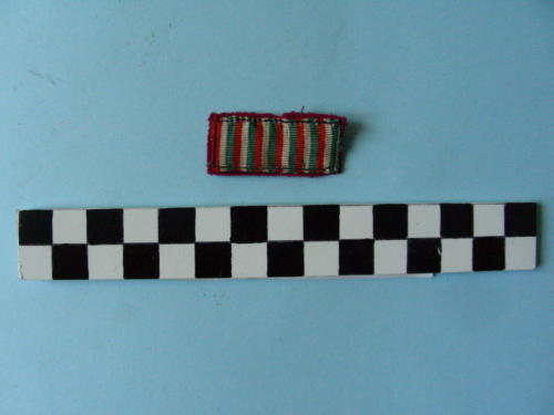 Di forma rettangolare, cucito su panno cremisi. A sei gruppi di strisce verticali di colore verde, bianco e rosso.