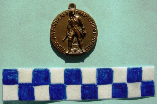 Disco di metallo, sul dritto al centro in rilievo, la figura piena di un soldato con divisa risorgimentale circondata da iscrizione. Sul verso iscrizioni al centro e sulla corona.